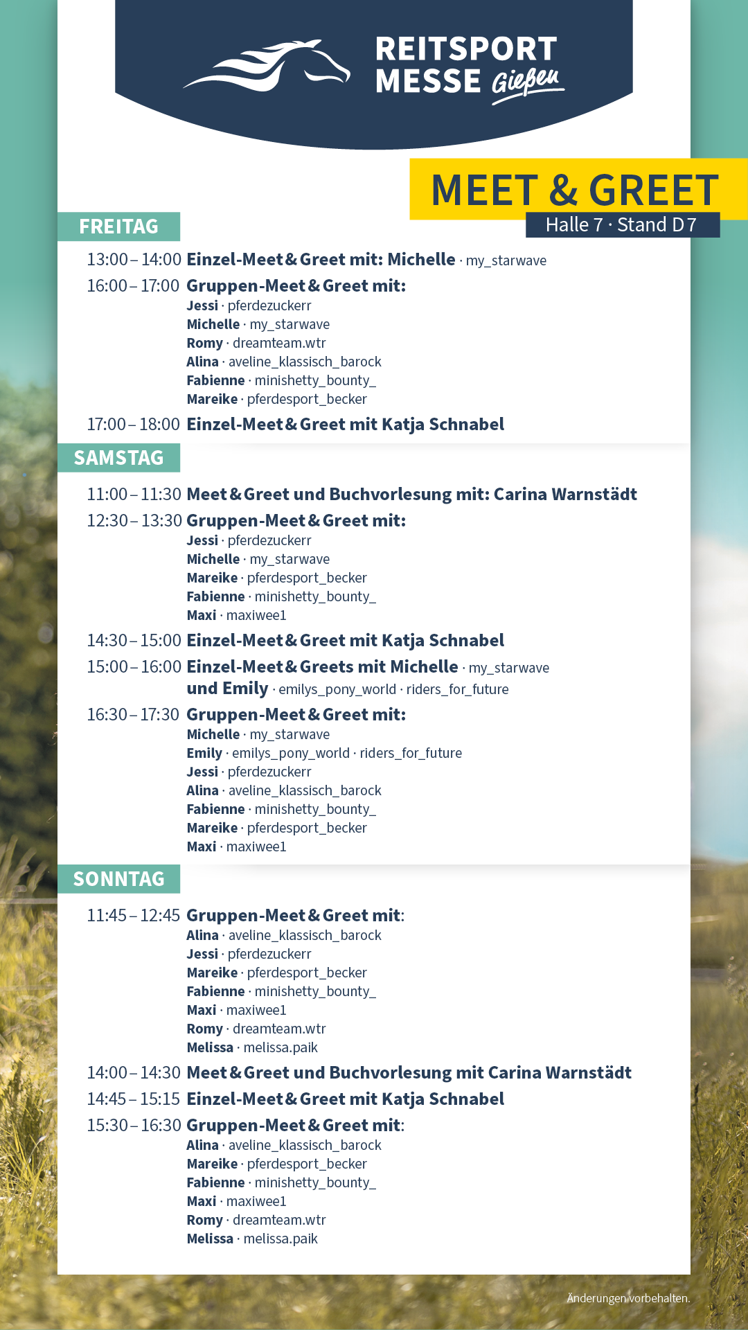 2025 wird es auf der REITSPORTMESSE Gießen wieder eine Meet & Greet Fläche geben (Halle 7, Stand D7), auf der folgende Content Creator zu treffen sind: